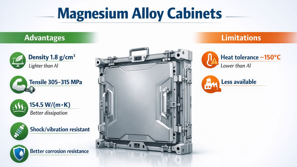Magnesium alloy has a long history in automotive and aerospace — it’s been trusted in demanding environments for decades. Its use in LED module cabinets is growing for the same reason: less weight, without giving up strength.