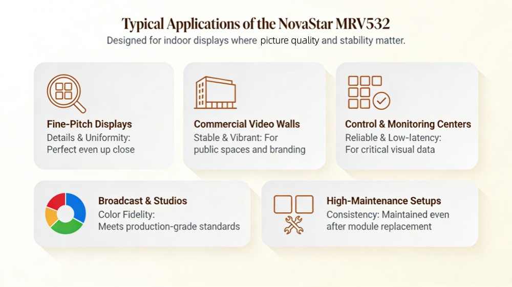 The NovaStar MRV532 is mainly used in indoor LED display projects where image quality and system stability are important. It is commonly selected for applications that require consistent brightness, accurate color control, and reliable long-term operation.